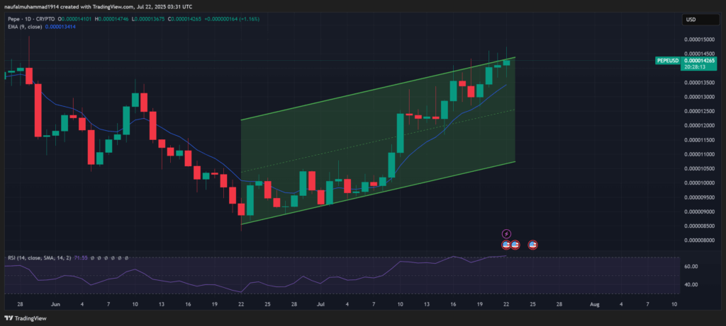 PEPE sedang menikmati momentum positif dengan kenaikan sekitar 42% dalam dua minggu terakhir.