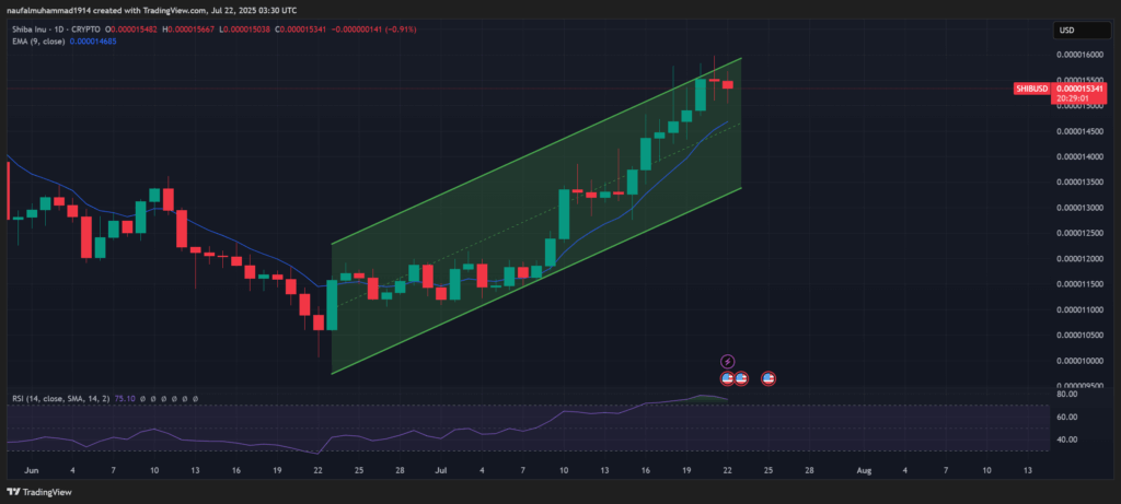 SHIB mencatat apresiasi sekitar 12% dalam 7 hari terakhir dan saat ini diperdagangkan di sekitar $0.00001534.