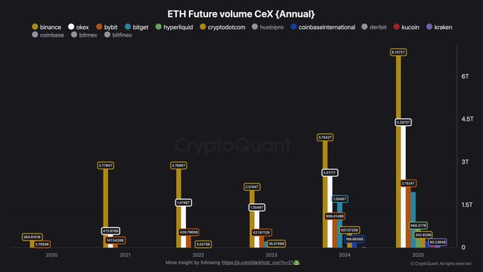 Fenomena ini paling jelas terlihat di Binance, nan kembali menjadi pusat likuiditas dunia untuk Ethereum. Sepanjang 2025, volume perdagangan ETH futures di Binance melampaui US$ 6,74 triliun, nyaris dua kali lipat dari capaian 2024 nan sebelumnya sudah sudah mencetak rekor. Lonjakan ini mempertegas pergeseran struktur pasar, di mana derivatif semakin mendominasi pembentukan harga.